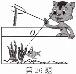 26. 小猫叉不着鱼,作图可解释。请完成小猫看见鱼(图中A点)的折射光路图。