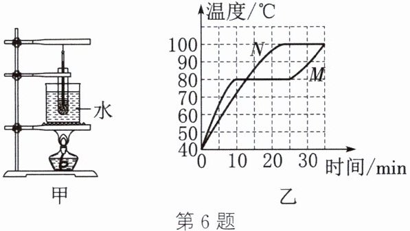6. 用两套完全相同(如图甲)的装置,在标准大气压下分别对装有少量质量相等的固体M和N的试管进行加热,M和N的温度一时间图像如图乙所示,在35 min内N始终是固体,则下列说法正确的是(