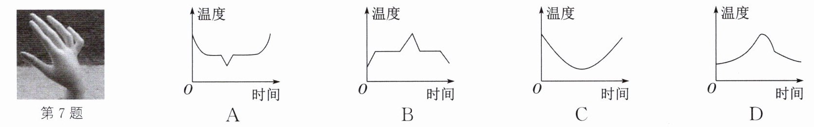 7. (2024·常州天宁校级模拟)小明参观蜡像馆时,了解到手模(如图)制作的过程:先将蜡熔化,将手浸入蜡液使手的表面沾满蜡液,再经过特殊工艺冷凝、脱模即可。在下列各图中,能正确描述蜡在整个过程中温度随时间变化的是(