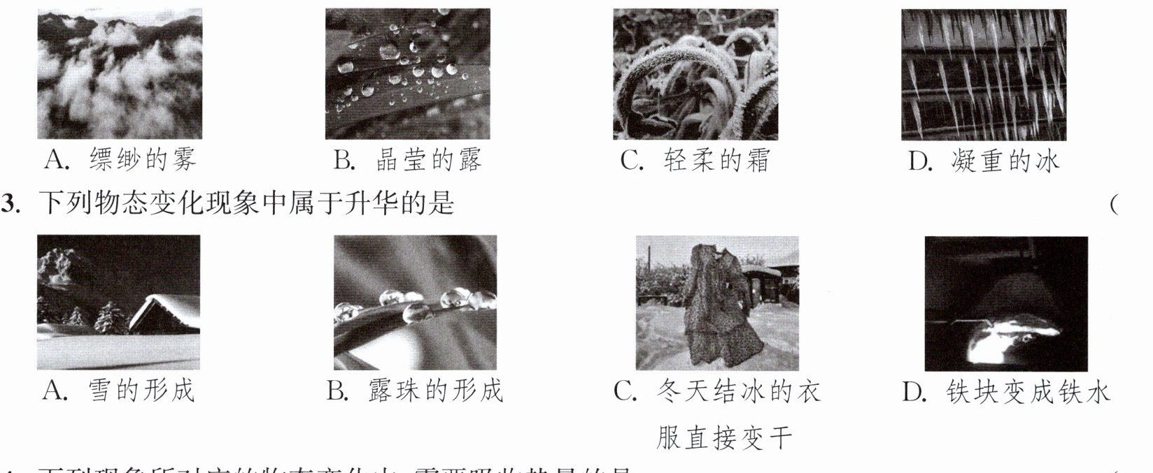 4. 下列现象所对应的物态变化中,需要吸收热量的是(