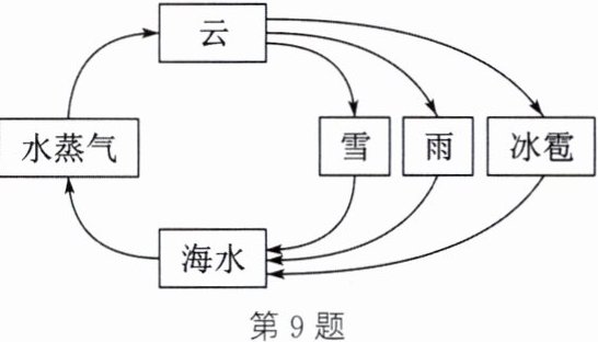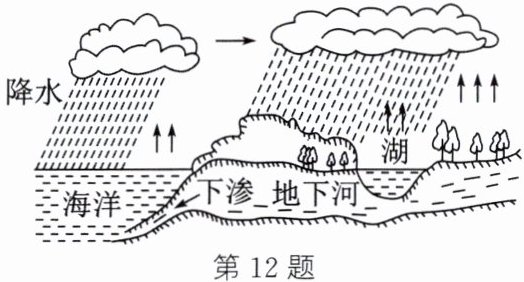 12. (教材P112 材料改编)如图是大自然中水循环现象的示意图。江、河、湖、海以及大地表层中的水不断蒸发变成水蒸气。当含有很多水蒸气的空气升入高空时,水蒸气的温度降低凝成小水滴或凝成小冰晶,这就是云。在一定条件下,云中的小水滴和小冰晶越来越大,就会下落。在下落过程中,小冰晶又变成小水滴,与原来的水滴一起落到地面,这就形成了雨。