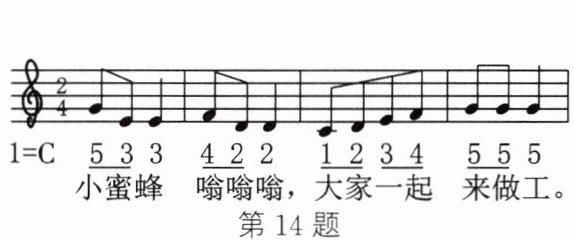 14. (教材P22练习T1变式)如图是童谣《小蜜蜂》的一段歌词与乐谱,当小玲唱到“大家一起”这四个字期间,音调逐渐升高。关于这期间小玲声音的变化,下列描述正确的是(