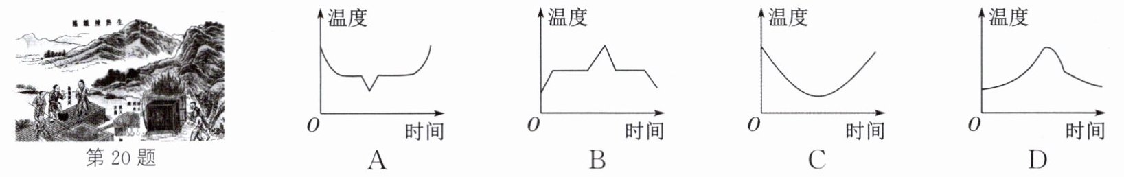 20. 《天工开物》初刊于明朝,如图是其中篇章"生熟炼铁矿":古人将铁料熔炼成铁水,炙热的铁水顺着高处管道流入几尺远的较低水井并完成淬火,最终制成熟铁。下列能正确反映将铁料炼成熟铁全过程的温度随时间变化图像的是(