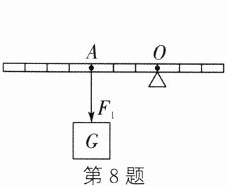 8. 如图所示,一根质量忽略不计的杠杆,支点为$O$,在$A点悬挂一重为20N$的物体,物体对杠杆的拉力为$F_{1}$。现在杠杆上施加一个大小为$10N$、方向竖直向上的力$F_{2}$,杠杆在水平位置保持平衡,请在图中画出拉力$F_{1}的力臂l_{1}以及拉力F_{2}$的示意图。