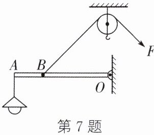 7. 某剧组为拍摄节目需要,设计了如图所示的拉力装置来改变照明灯的高度,轻质杠杆$ABO可绕O$点转动,请在图中画出杠杆所受拉力的力臂$l_{1}和杠杆所受阻力F_{2}$的示意图。