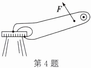 4. 如图所示,用开启啤酒瓶盖的工具开启瓶盖。请在图中标出支点$O$的位置,画出力$F$的力臂。