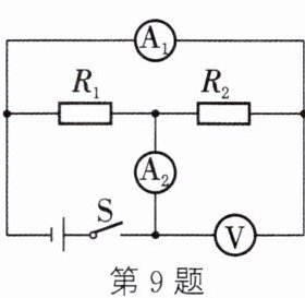 8. 在如图所示的电路中,两只电流表的规格相同,电流表均有两个量程(0~0.6 A 以及 0~3 A)。闭合开关 S,电阻$R_{1}与R_{2}$中均有电流通过,两只电流表的指针偏转角度相同,则$R_{1}与R_{2}$的阻值之比为 (