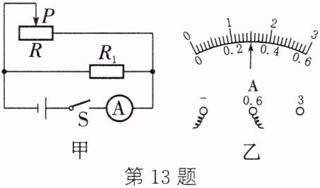 13. 如图甲所示电路中,电源电压为 6 V,电阻$R_{1}= 30Ω$,闭合开关,当滑动变阻器滑片滑至某处位置时,电路中的电流表示数如图乙所示。求: