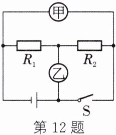 12. 如图所示电路,电源电压恒定不变,$R_{1}= 4Ω,R_{2}= 2Ω$。当开关 S 闭合,甲、乙两表均为电压表时,甲、乙两表的示数之比为