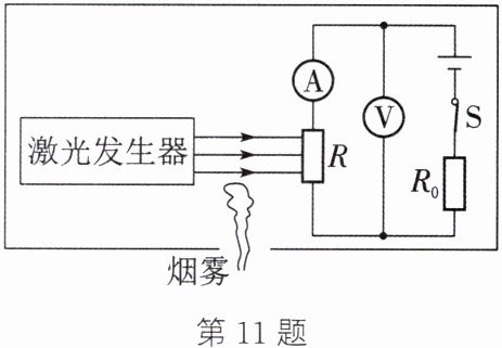 11. (2023·聊城)如图所示为列车上烟雾报警器的简化原理图。其内装有一个激光发生器及带有一光敏电阻R的电路,其中电源电压恒定,$R_{0}$为定值电阻。有烟雾产生时,激光被烟雾遮挡而使光敏电阻的阻值发生变化,从而改变电路中的电流。当电路中的电流增大至某一数值时报警器开始报警。下列说法中正确的是 (