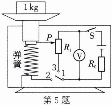 5. (2024·无锡期末)在物理跨学科实践活动课上,小华和同学利用所学的电学知识,设计了电子秤的原理图,如图所示。它利用电压表的示数来表示物体的质量,托盘、轻弹簧上端和金属滑片固定在一起(托盘和弹簧的质量、电阻均不计)。已知电源电压$U= 3V$,电阻$R_{0}= 10Ω$,电阻$R_{1}= 20Ω$,电压表的量程为$0\sim 3V$。