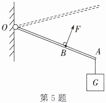 5. (2024·宿迁泗阳校级段考)如图所示,轻质杠杆$OA可绕固定点O$转动,$A处挂一重物G$,$B处有一个始终垂直于OA的拉力F$,使杠杆缓慢地向图中虚线位置移动的过程中,关于拉力$F$的说法正确的是 (