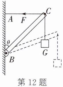 12. 如图所示,轻质细杆$BC可绕竖直墙上的B$点转动,末端$C$点挂一重物,重力为$200\mathrm{N}$,拉力$F$始终沿水平方向,此时$\theta =45^{\circ}$,则拉力$F= $