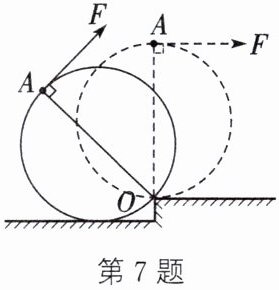 7. 如图所示,质地均匀的圆柱在拉力$F$的作用下由实线所示位置匀速转到虚线所示位置,整个过程中,拉力$F始终作用于A点且与OA$保持垂直($OA$为圆柱横截面的一条直径),圆柱在转动过程中不打滑。下列分析正确的是 (