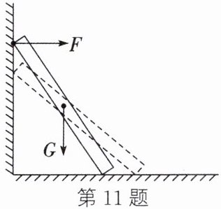 11. 一根粗细均匀的木棒斜靠在竖直墙壁上,墙壁光滑,地面粗糙,木棒受到的重力为$G$,墙壁对木棒的弹力为$F$,如图所示。现让木棒的倾斜程度变小一些至虚线所示位置,木棒仍能静止斜靠在墙上。与原来相比,$F$的变化情况为