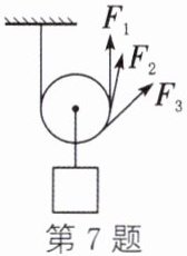 7. 使用一个动滑轮匀速提升同一个物体时,若分别沿如图所示的方向用力,则$F_1、$$F_2$和$F_3$这三个力的大小关系是(
