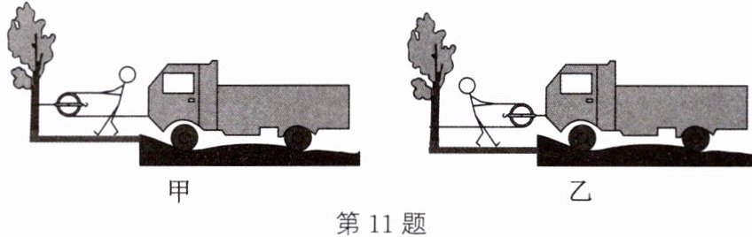11. 一辆货车陷进了泥潭,司机按图甲、图乙两种方式安装滑轮,均能将货车从泥潭中拉出。图甲中的滑轮是