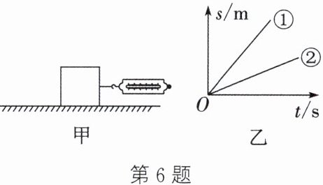 6. 如图甲所示,木块放在水平面上,用弹簧测力计沿水平方向拉木块使其做直线运动,两次拉动木块得到的$s-t$图线分别是图乙中的①和②。两次对应的弹簧测力计示数分别为$F_{1}$、$F_{2}$,两次拉力的功率分别为$P_{1}$、$P_{2}$,则$F_{1}$