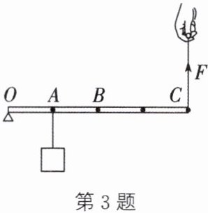 3. 如图所示为一根均匀的细木棒$OC$,$OA= \frac{1}{4}OC$,$B为OC$的中点。小明在$C点施加始终竖直向上的拉力F将挂在A$点的重为180N的物体匀速提升0.2m,细木棒的机械效率为90%,不计摩擦和绳子重。求: