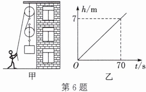6. (2024·宿迁泗阳期中)生活中有些低层建筑没有电梯,房屋装修时工人师傅常用滑轮组提升重物。某工人用如图甲所示的滑轮组将400N的重物匀速提升7m,拉力为250N,重物上升的高度$h与所用时间t$的关系图像如图乙所示。已知工人的质量为50kg,不计绳重和摩擦,$g$取10N/kg。求: