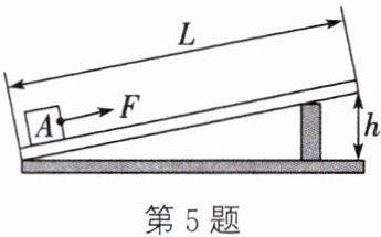 5. 如图所示,工人需把重为1200N的木箱$A拉到高h= 2m$、长$L= 10m$的斜面顶端。工人沿斜面向上用时60s将木箱$A$从斜面底端匀速直线拉到斜面顶端,已知拉力$F$的功率为80W。则: