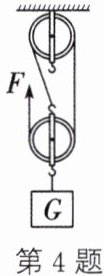 4. (2024·南通海门期末)如图所示的滑轮组下挂一重为45N的物体,现用20N的拉力$F$在4s内将物体匀速提升2m。求: