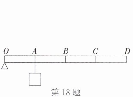 18. (2024·南京期末)如图所示,一根均匀的细木棒可绕O点无摩擦转动,OA= AB= BC= CD,对杠杆施加力F,将挂在A点重为180N的物体匀速提升0.4m。以下说法正确的是 (