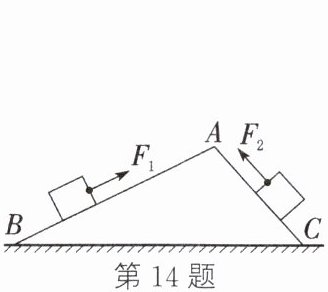 14. 如图所示,光滑斜面AB>AC,沿斜面AB和AC分别将同一重物从它们的底部拉到顶部所用时间相同,所需拉力分别为$F_1$和$F_2,$所做的功的功率分别为$P_1$和$P_2,$则 (