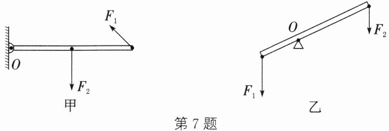 7. 如图,已给出各杠杆所受力$F_{1}和阻力F_{2}$,请作出动力臂$l_{1}与阻力臂l_{2}$。
