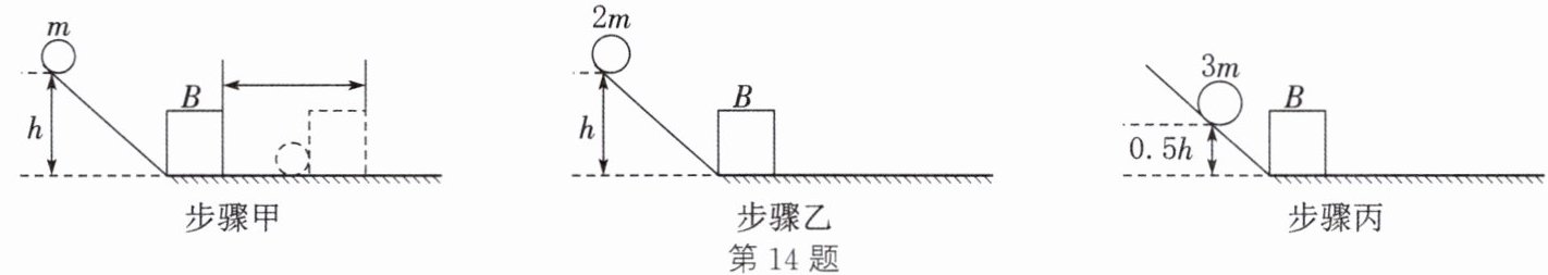 14. (2024·宿迁宿城期末)如图所示是某学习小组探究“动能大小跟哪些因素有关”的实验操作(有一木块静止放在水平面上,甲、乙、丙中小球质量分别为m、2m、3m)。