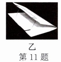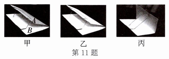 11. 如图所示,小明利用硬卡片做了“会跳的卡片”。图甲中,A为外表面,B为内表面,实验时用手把卡片平压在桌面上,使橡皮筋伸长,当