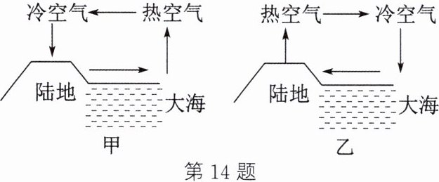 14. (2024·宿迁期中)在沿海地区炎热晴朗的天气里,易形成海陆风。陆风和海风是由于地面和大海升温 和降温的快慢不同,从而使空气对流形成的。形成海陆风的根本原因是海水和沙石的