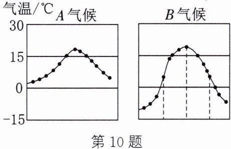 10. 同学们通过地理课的学习知道,温带海洋性气候大多分布在沿海地区,而温带大陆性气候大多分布在内陆地区。如图所示为两气候地区的全年温度变化曲线,从物理的角度分析,下列说法正确的是 (
