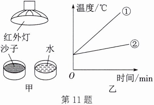 11. (2024·无锡期末)如图甲所示为“观察不同物质吸热升温现象”的装置。将初温相同、质量均为$50g$的沙子和水分别放在两个瓷碗中,用红外灯均匀照射两个瓷碗$4min$后,再用温度计分别测出沙子和水的温度。此时沙子的温度为$55.4^{\circ }C$,水的温度为$30.7^{\circ }C$,下列有关该实验的说法正确的是 (