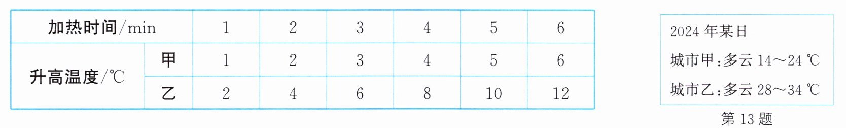 |升高温度/℃|甲|1|2|3|4|5|6|