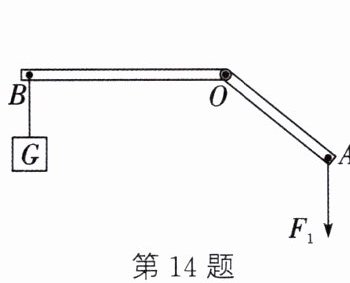 14. (2023·南通)如图,杠杆AOB保持静止,O为支点,请作出动力$F_{1}的力臂l_{1}和阻力F_{2}$。