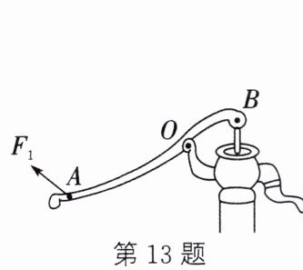 13. (2024·宿迁沭阳段考)如图是一种活塞式抽水机的示意图,其中手柄AOB是一个杠杆,杠杆在动力$F_{1}$的作用下绕O点匀速转动,请在图中画出$F_{1}的力臂及阻力F_{2}$的示意图。
