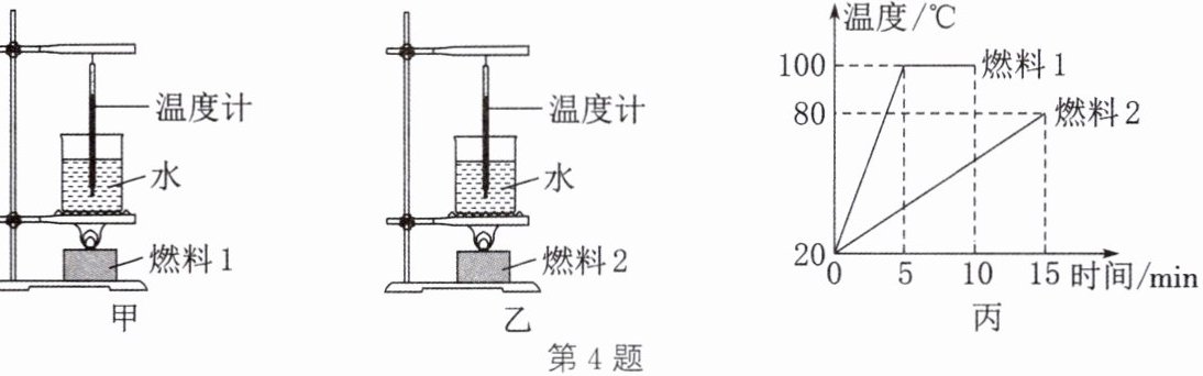 4. 为了比较不同燃料燃烧放热能力的差异,小明设计了如图甲、乙所示的两组对比实验。实验装置完全相同,燃料的质量、烧杯内水的初温和质量也都相同。实验中忽略热量的散失,已知两种燃料燃烧时均匀放热。