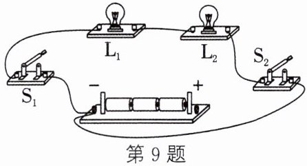 9. 用一根导线完成图中电路的实物连接。要求:两灯并联,$S_{1}$、$S_{2}分别控制L_{1}$、$L_{2}$。