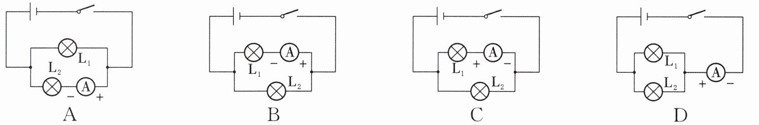 4. 下列电路中,电流表能测通过灯 $ L_1 $ 电流的是 (