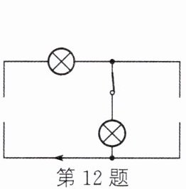 12. 如图所示为一个不完整的电路图,其中箭头所指的方向表示电路接通时的电流方向,请在图中两个空缺的位置分别补画电源或电压表的符号,使之成为一个完整的串联电路。