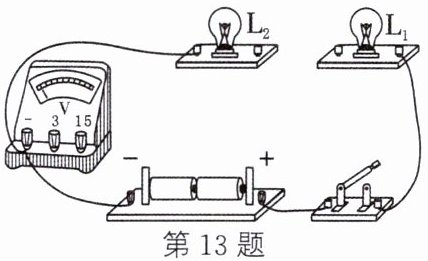 13. 如图所示的实物电路中,有两根导线尚未连接,用笔画线代替导线将电路连接完整。要求:两灯串联,电压表只测灯 $L_{2}$ 两端的电压,导线不能交叉,考虑电压表量程的选择。