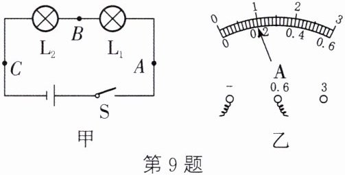 9. 如图甲所示的串联电路中,闭合开关S时,小桂发现$L_{1}比L_{2}$亮,他猜想可能有下列原因:猜想一:通过$L_{1}的电流比通过L_{2}$的大。猜想二:$L_{1}$更加靠近电源正极。为验证猜想,他做了以下探究。