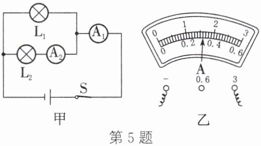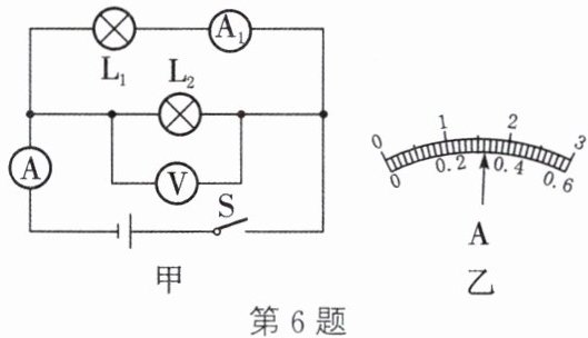 6. 如图甲所示的电路中,电源电压恒为3V。闭合开关S后,电流表A、$A_{1}$的示数均如图乙所示,则通过小灯泡$L_{2}$的电流为