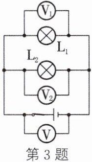 3. 如图所示,灯泡$L_{1}比L_{2}$亮,电压表$V_{2}$的示数为6V,下列说法正确的是(
