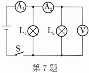 7. 如图所示,开关S闭合,两个灯均正常发光,电流表$A_{1}$的示数为0.6A,电流表$A_{2}$的示数为0.4A,电压表的示数为5V。下列说法正确的是(