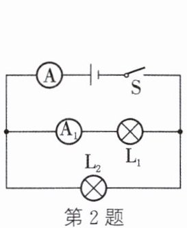 2. 如图所示的电路中,闭合开关S后,电流表$A_{1}$的示数是0.2A,电流表A的示数是0.45A,则通过灯$L_{2}$的电流是(