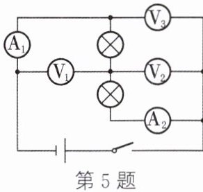 5. 如图所示的电路中,闭合开关,电压表$V_{1}$、$V_{2}和V_{3}的示数分别为U_{1}$、$U_{2}和U_{3}$,电流表$A_{1}和A_{2}的示数分别为I_{1}和I_{2}$,则下列关系正确的是(