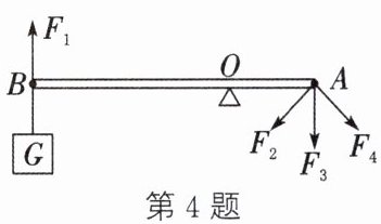 4. (2024·宿迁泗阳期末)如图所示,O为轻质杠杆AB的支点,B点挂一重物G,现分别用$F_1、$$F_2、$$F_3、$$F_4$作用于杠杆,且均能使杠杆保持水平位置平衡,则其中最小的力是 (