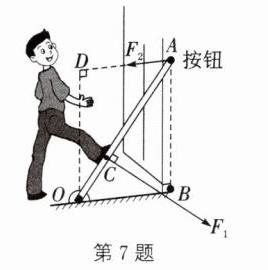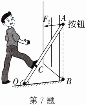 7. 为避免同学们用手按压宿舍楼大门的开门按钮造成交叉感染,小明用轻质木杆自制了“脚踏式杠杆”,借助杠杆按动按钮,如图所示,已知OB= 60 cm、AB= 80 cm、OC= 15 cm,当小明在C点用脚给杠杆施加20 N的压力$F_1$时,按钮触发,大门打开。